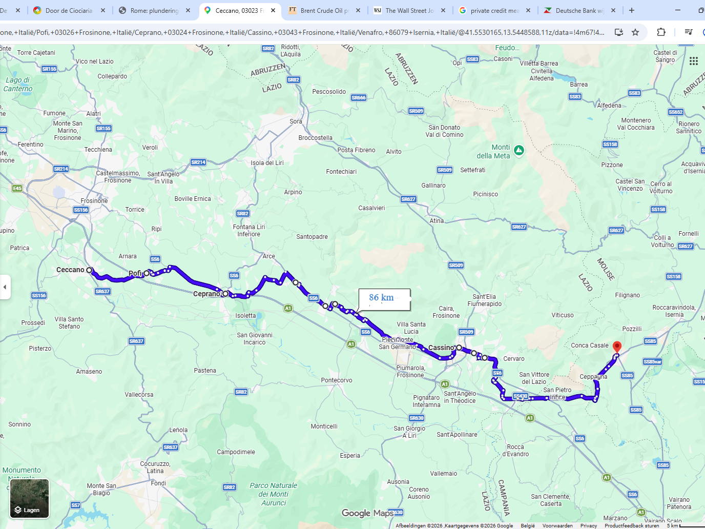 Na een kort oponthoud in een bar tegenover het station van Monte Cassino trek ik verder naar Venafro. Het is opgehouden met regenen, maar vele fietsstroken staan blank omdat de stadsriolen het water niet meer kunnen slikken. De rivier Rapido, die de geallieerden hier 79 jaar geleden ten koste van veel bloedvergieten uiteindelijk toch wisten over te steken, is hier vandaag een kolkende watermassa die de regen uit de bergen naar de vallei leidt. De SR 6 naar Napels, de Via Caselina is hier vanavond bijzonder druk en op vele stroken wordt er zelfs stapvoets gereden. Ik manoeuvreer zo goed ik kan tussen de auto’s, zenuwachtig getoeter trotserend tot de verkeersstroom weer op gang komt. Na 13 km stresserend verkeer kan ik in San Pietro Infine eindelijk links afslaan naar Venafro en het drukke, enerverende verkeer op de weg naar Napels achter me laten. Ik ben inmiddels in Campanië beland, de regio rond Napels en bevind me op de SS6 Diramazione via Caselina, letterlijk een aftakking van de via Caselina. De uitlopers van de Abruzzi komen hier heel dichtbij en ik klim langzaam over 5 km in het schemerdonker tot aan een tunnel die door een berg heen is gegraven en die gelukkig verlicht is. Wanneer ik uiteindelijk aan de andere kant tevoorschijn kom, bevind ik me alweer in een andere regio, Molise. Vanaf hier gaat het grotendeels bergaf tot aan de lichtvlek in de vallei voor me. Dat kan alleen maar Venafro zijn. Ik neem mijn intrek in een b&b op de eerste verdieping van een soort woonkazerne die uitkijkt op een binnenkoer. Mijn gastvrouw is zeer behulpzaam, maar haar twee keffers gaan wild tekeer. Ze beschouwen me als een indringer als ik met mijn fietszakken door de woonkamer stap. Ik krijg een ruime kamer die bij nader inzien een tot gastenverblijf heringerichte kinderkamer blijkt te zijn. De douche en badkamer is gemeenschappelijk, want in een tweede kinderkamer is een Italiaans koppel gelogeerd. In de badkamer laat ik het warme water van de douche over mijn kruin en verkrampte leden stromen en beleef weer eens het hoogtepunt van de dag. Daarna begeef ik me in de straten van het stadje, dat tot mijn verbazing nog een erg levendige indruk maakt op een doorsnee zondagavond.