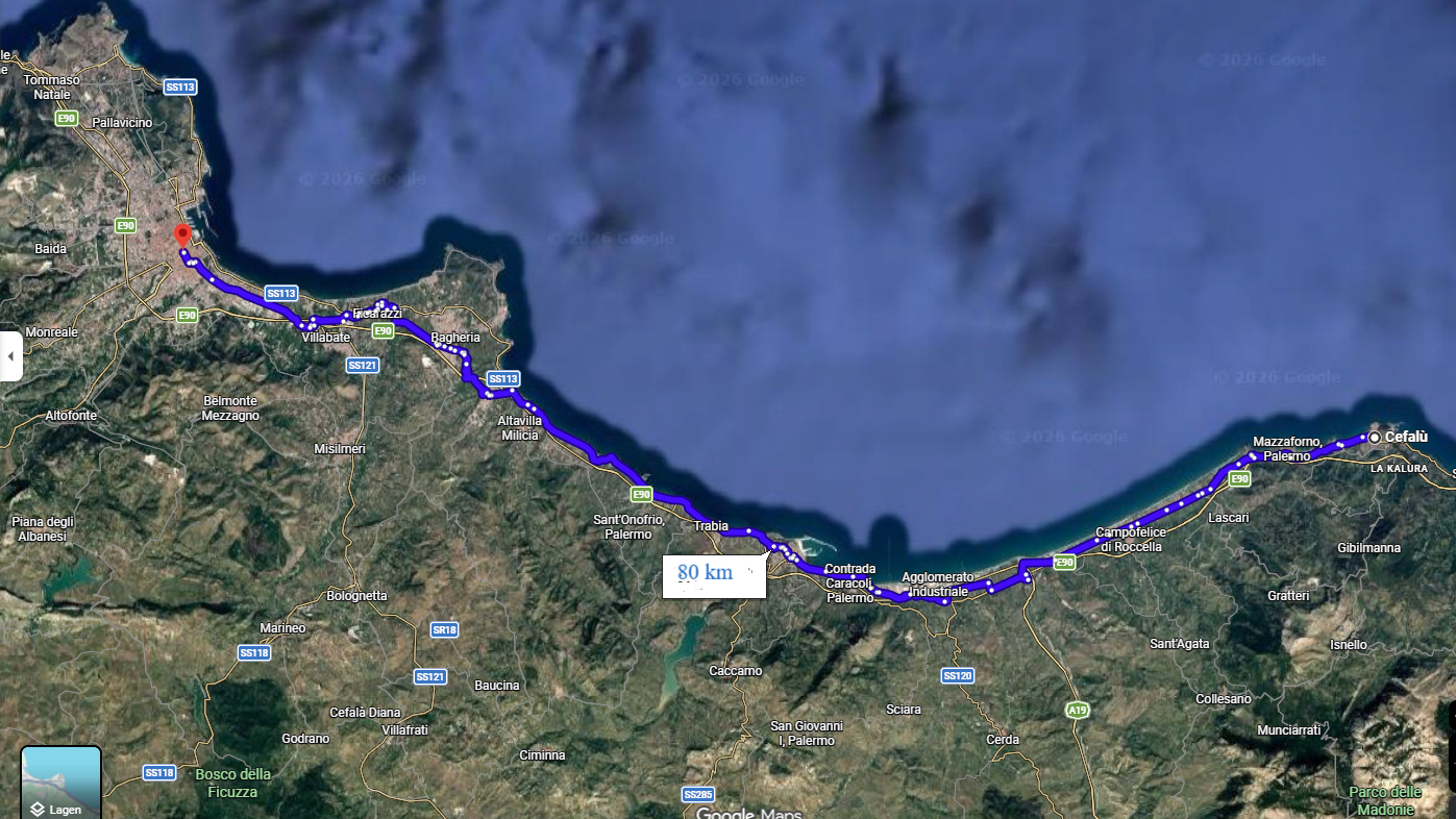 Wie vanuit Cefalù de bergen van de Madonie in wil, kan dat via de Strada Statale 643 en de SP128 - SP 54 - SP 119. Maar daarvoor heb ik de tijd niet, de beschrijving die volgt is op basis van foto’s en een videovoorstelling die ik heb gezien. De SP 54 loopt dwars door het Parco delle Madonie over een weg die tot boven de 1600 meter stijgt. Hier kom je in de hoogste regionen van het park, waar ook de Pizzo Carbonara ligt, de hoogste top op 1979 meter hoogte. De vegetatie is hier schraler, de bodem rotsachtiger en het landschap ruiger. De klim vanuit Cefalù op de noordelijke flanken loopt door groen weiland en bossen. Het is de kant die het meeste neerslag krijgt, de zuidelijke hellingen naar het binnenland zijn kaler en ruiger. Schilderachtige dorpjes als Petralia Sottana en Petralia Soprana liggen op respectievelijk 1000 en 1150 meter hoogte en Polizzi Generosa dat op 920 meter ligt, is als een arendsnest op een rots gebouwd. Het was een bolwerk tegen de Sarazenen onder Roger II.