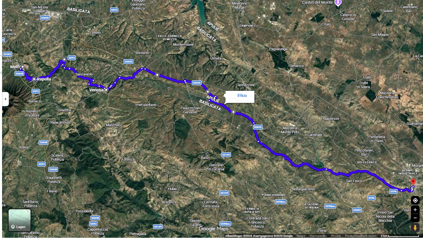 De rustdag die ik mezelf had beloofd om de batterijen weer wat op te laden (figuurlijk, mijn fiets is geen EV), heb ik niet in Melfi genomen. Een kleine rondrit door het historische centrum van het stadje overtuigt me dat hier weinig te zien en te beleven valt. Het is zaterdag en de straatjes zijn hier zo smal dat ik zelfs met mijn fiets even moet uitwijken in een portaal wanneer een bruiloft door de steegjes van het centrum trekt. Een groep vrouwen uitgedost in kleurrijke lange jurken volgt de stoet op hoge hakken, een halsbrekende onderneming op de schots en scheve plaveien van de binnenstad. De mannen in hun zwarte pakken lopen er op hun glanzende zwarte lakschoenen merkelijk ontspannender bij.