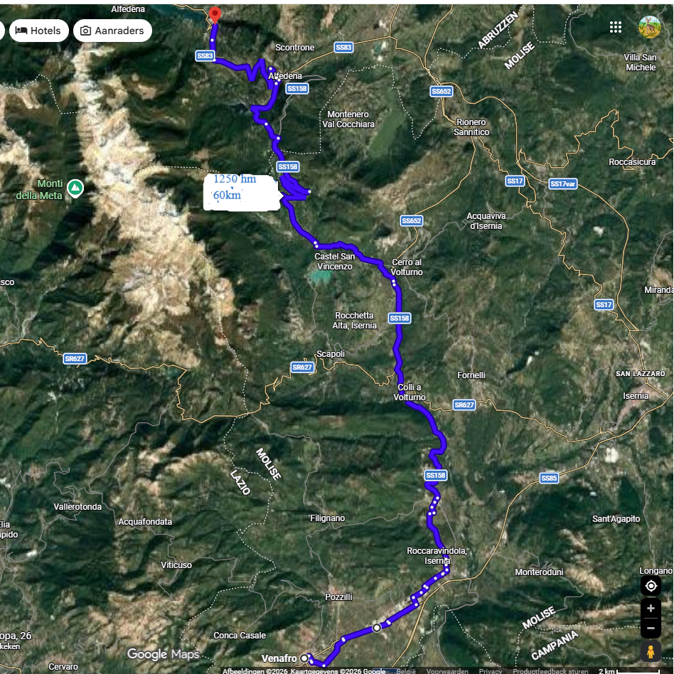 Behalve het geluid van occasioneel voorbijrijdende wagens is er alleen het ruisen van de wind in de toppen van de bomen. Ik trap op een tempo dat ik lang kan volhouden, zo spaar ik mijn krachten. Het struikgewas maakt op de meeste plaatsen het bos onzichtbaar tot ik links aan de overkant het geknor van een everzwijn hoor. Het dier is nu goed zichtbaar en maakt aanstalten om de weg over te steken, maar maakt bruusk rechtsomkeer. Rechts op zo’n 20 meter ontwaar ik de contouren van een groot bruin dier dat ik niet herken, maar dat even snel weer verdwijnt: een hert of een beer? Ik zal het nooit te weten komen. De kans dat het alleen maar mijn verbeelding was is groot, maar een beer in deze omgeving is niet helemaal uitgesloten. Het Parco Nazionale di Molise e Abruzzo telt namelijk nog een vijftigtal beren en hier bevind ik me toch aan de rand van dat park. Midden in deze wildernis meldt een bord mij dat ik de regio Molise verlaat en in de regio Abruzzo ben beland. Even verderop is er links een weggetje naar het Lago Montagna Spaccata en sneller dan verwacht bereik ik iets wat op een top lijkt op zo’n 1120 meter. De weg wordt hier even vlak en het landschap wat opener. Alfadena ligt 200 hoogtemeters lager in de vallei van de Sangro rivier en de afdaling is 6 km lang. Na de lange klim is de daling een verademing. Ik geniet van de koele wind en de snelheid waarmee de laatste kilometers van de SS158 voorbijvliegen. Maar volop genieten is er niet bij, want terwijl ik naar beneden raas, groeit het besef ik dat ik straks weer met hard labeur uit diezelfde vallei moet klimmen.